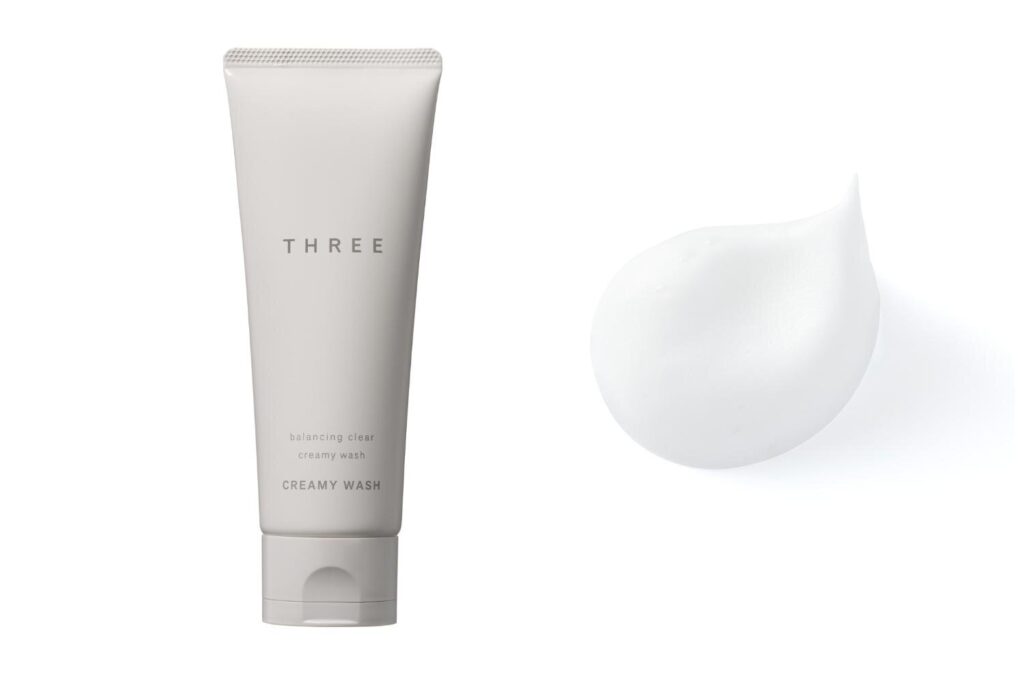 「THREE バランシング クリア クリーミー ウォッシュ」は、うるおいヴェールで包み込みながら、毛穴奥の汚れを一掃する濃密マイクロ泡の洗顔料。濃密でボリューミーな泡立ちのクリームが、毛穴やキメの間の乾燥パーツを隅々までうるおいで満たし、乾燥した古い角質や汚れなどのくすみ要因を吸い込むようにしっかりオフ。洗いあがりは、スキンケアをした後のように明るくしっとりと、なめらかな肌を叶える。